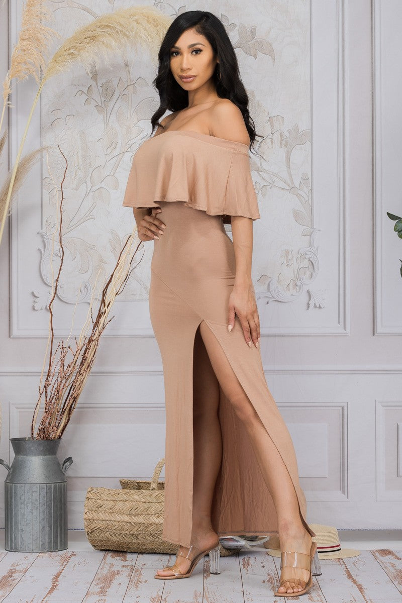 VESTIDO MAXI LISO CON HOMBROS ABIERTOS