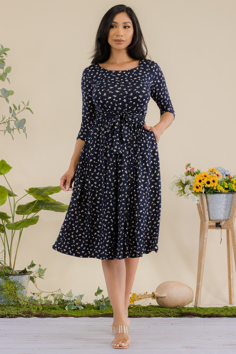 JR779X-DITSY - Vestido con lazo en la cintura y manga 3/4