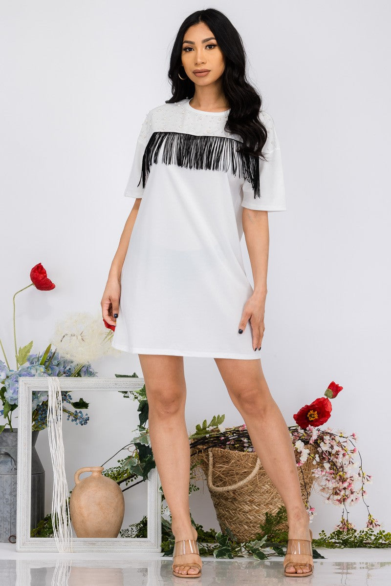 DROP SHOULDER PEARL BEADED DRESS