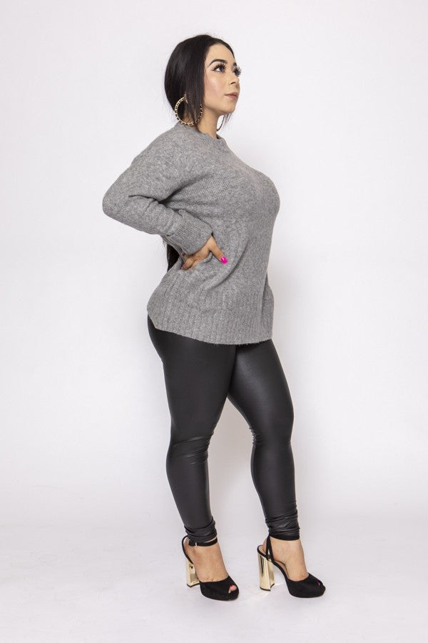 A knit blend pull over sweater, featuring a mock neck, long sleeves and banded cuffs.