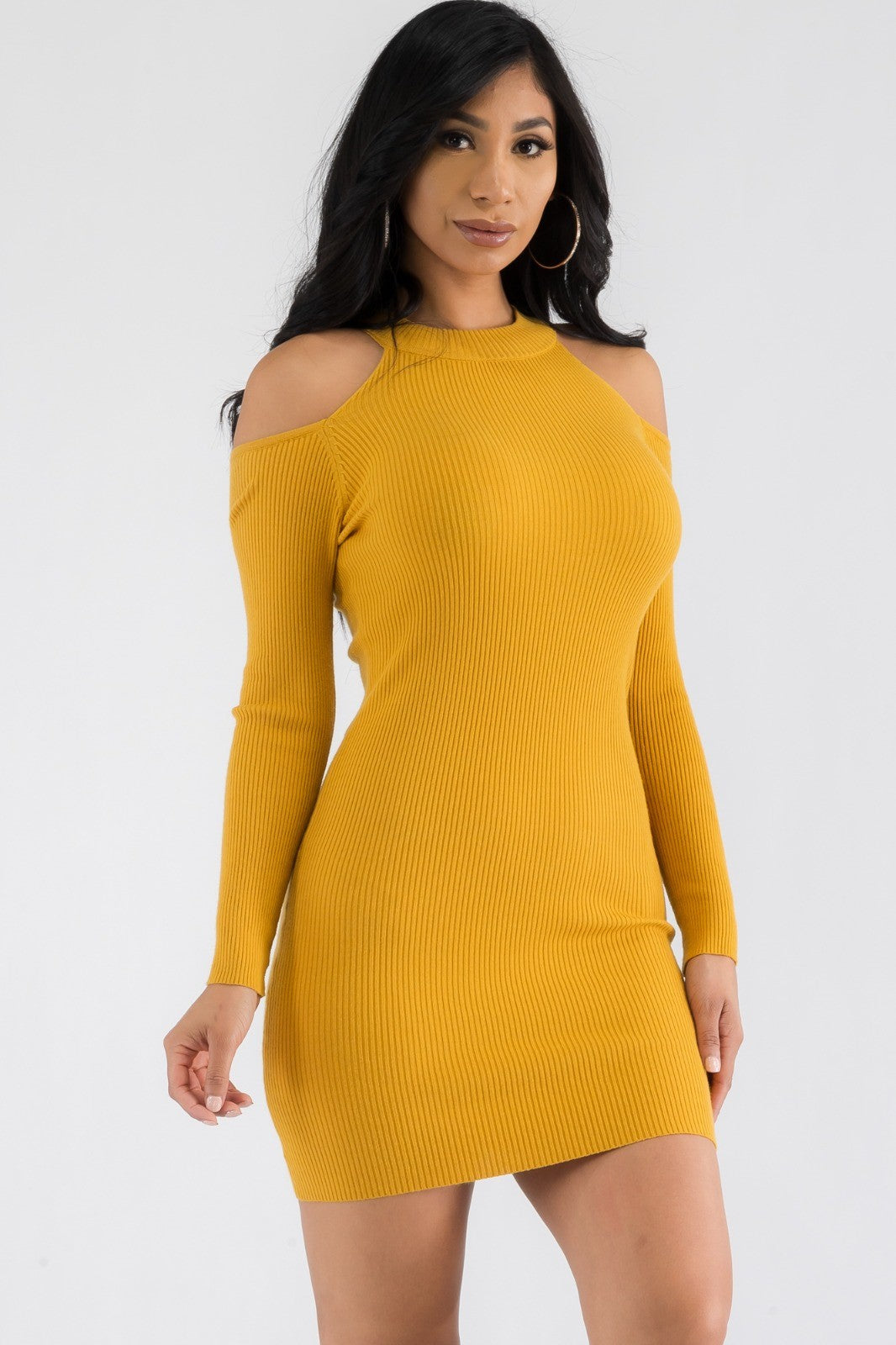 CH127R-LS - COLD SHOULDER MINI RIBBED DRESS