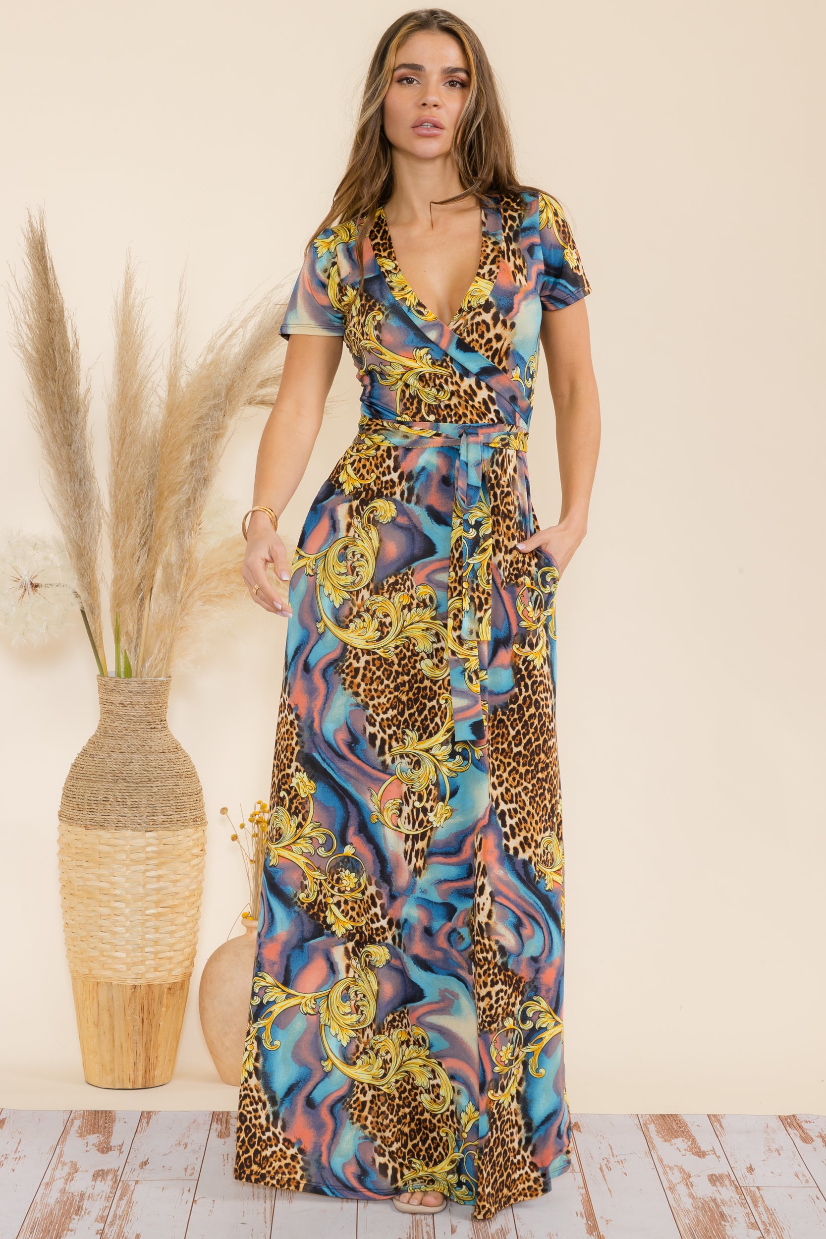 SAN149BX-P1 Plus Animal Faux Wrap Maxi Dress